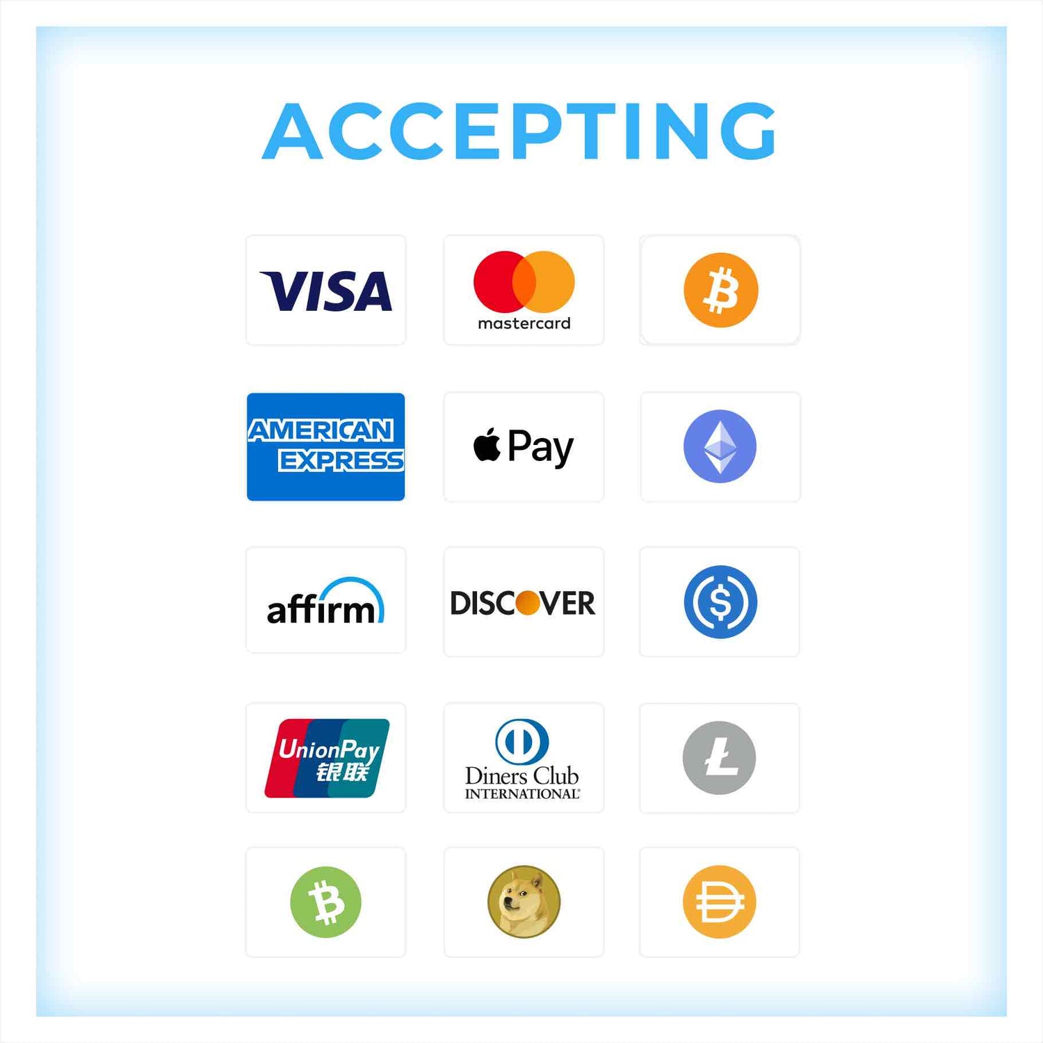 We partnered up with Coinbase Commerce for accepting crypto payments. The following crypto payment methods are accepted: Bitcoin, Ethereum, USDC, Litecoin, Bitcoin Cash, Dogecoin and Dai.